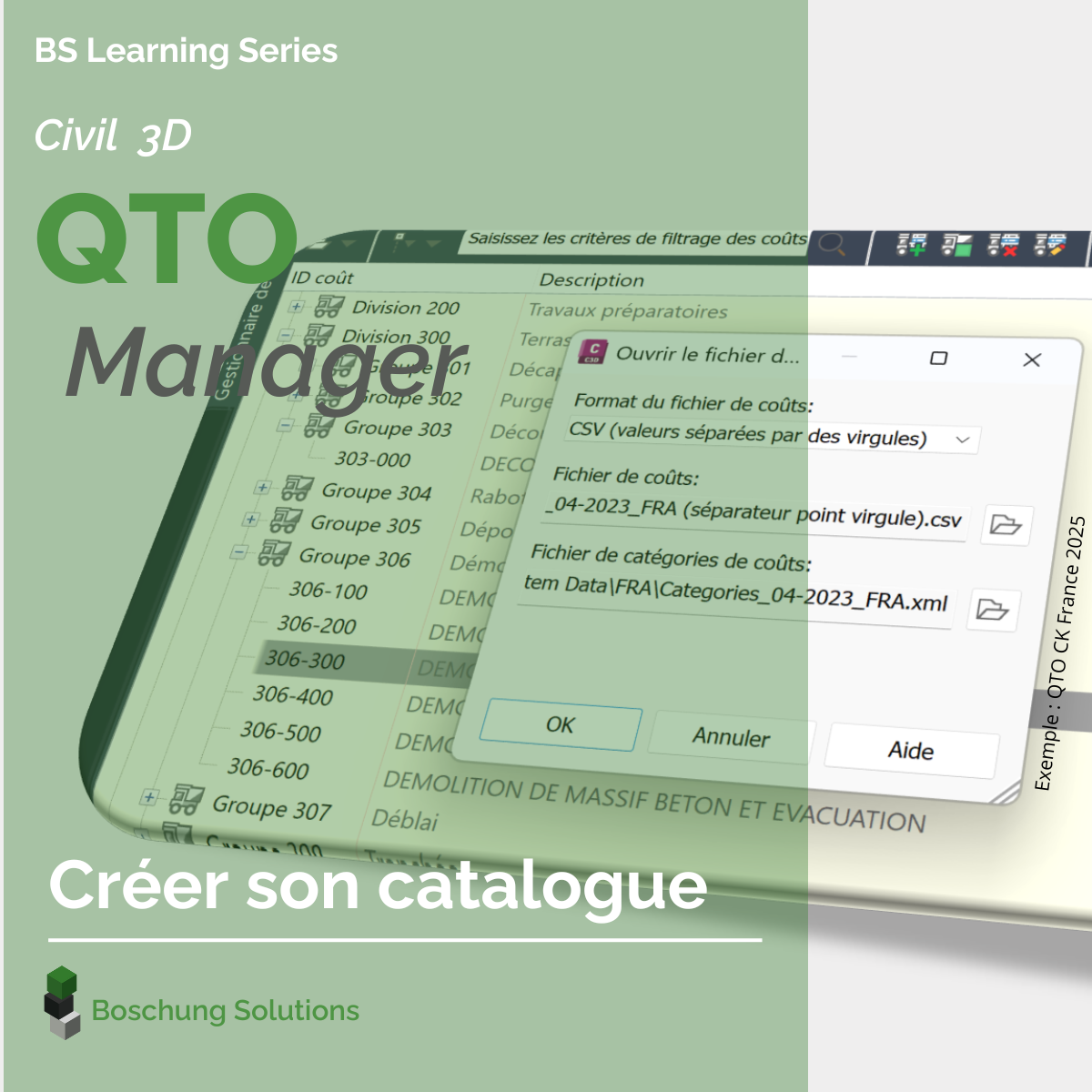 Ensemble, ils forment ton premier catalogue QTO, la base de tout mรฉtrรฉ dans Civil 3D. Cโest lui qui fait le lien entre la logique du modรจle et tes rรฉsultats chiffrรฉs.